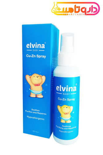 Elvina Baby Cu Zn Spray• قبل از مصرف بطری اسپری را بهخوبی تکان دهید. • محلول را در ناحیه موردنظر اسپری نکنید. • پوست را با ملایمت ماساژ دهید تا بهصورت کامل جذب شود.
