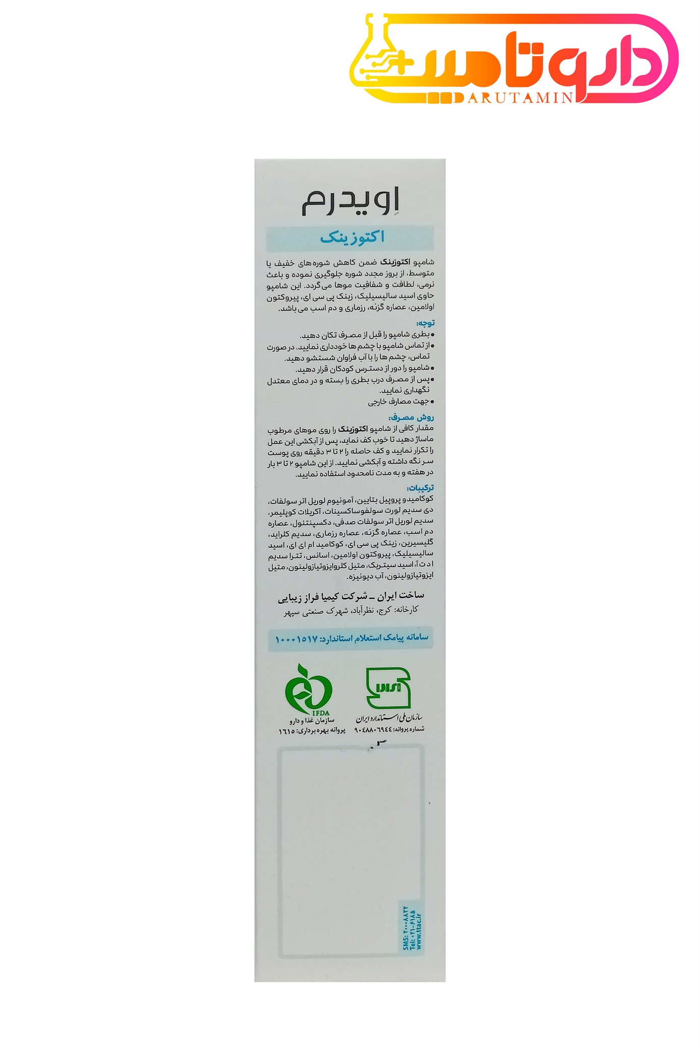 شامپو ضدشوره روزانه اکتوزینک اویدرم یک محصول ایرانی، تولید شرکت کیمیا فراز زیبایی است که با حجم ۲۵۰ میلیلیتر، برای انواع مو فرموله شده است. این محصول بهعنوان راهحلی آسان و تاثیرگذار، برای درمان و بهبود شوره سر توصیه میشود که از طریق سایت داروتامین، قابل سفارش و دریافت در محل موردنظر شما است.