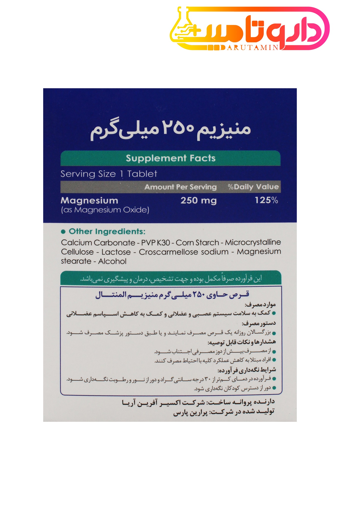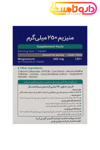 Exir Afarin Arya Magnesium 250mg Tabletصادر کننده مجوز