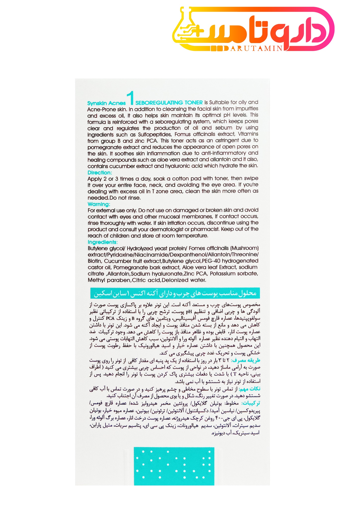 Synskin Acnes 1 Seboregulating Tonerروزانه ۲ تا ۳ بار از ساین اسکین تونر تنظیم کننده چربی پوست آکنس ۱ استفاده کنید. در هر بار استفاده یک پد پنبهای را به مقدار کافی از تونر آغشته کنید و سپس به آرامی آن را روی پوست ماساژ دهید. بهتر است نواحی از پوست که چربی بیشتری دارد، مانند ناحیه T و اطراف بینی را دفعات بیشتری با تونر پاک کنید. لازم به ذکر است پس از استفاده از تونر پاک کننده، صورت شما دیگر نیازی به شستشو با آب نخواهد داشت.