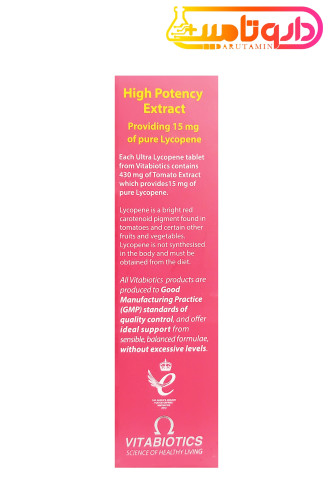 این قرص اولترا لیکوپن ویتابیوتیکس، یک منبع غنی از یکی از قویترین آنتیاکسیدانهای شناختهشده است. این قرص حاوی ماده لیکوپن است که یک ترکیب طبیعی موجود در گوجهفرنگی بوده و با مقادیر بالایی در قرص اولترا لیکوپن خالصسازی شده است. این قرص به صورتی ساخته شده است که هیچ گونه رنگ، ماده نگهدارنده، مخمر، لاکتوز، گلوتن، نمک و سایر مواد مضر در آن به کار نبرده شده است.