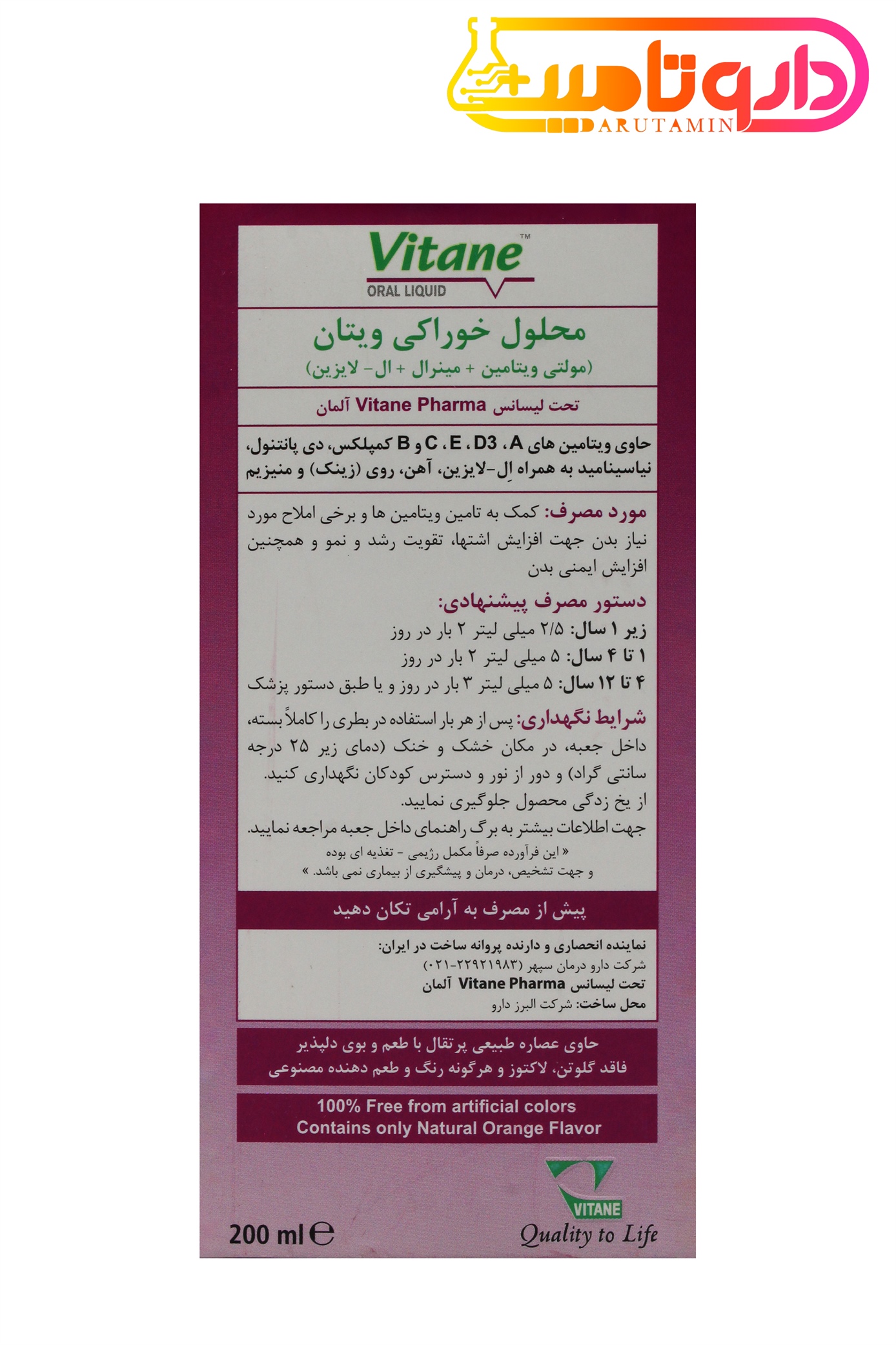 محلول خوراکی ویتان (مولتی ویتامین+مینرال+ال لایزین) ویتان فارما
